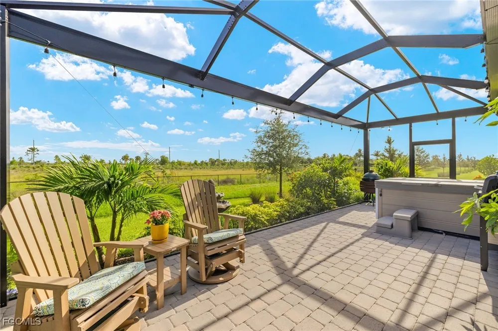 Discover this stunning Hallmark floor plan by Pulte Homes, located in the highly sought-after, gated community of Verdana Village. This home offers an unparalleled blend of luxurious comfort and an active resort-style experience, boasting over $113,000 in both builder and owner upgrades! Step inside this 3-bedroom, 2-bathroom residence, spanning 1,677 square feet of meticulously designed living space. Throughout, you'll find elegant plantation shutters in every room and upgraded tile flooring in an offset pattern, setting a sophisticated tone. The open-concept design seamlessly connects the spacious great room, dining area, and a gourmet kitchen. The extensively upgraded kitchen features a desirable layout with 42" upper cabinets, soft-close drawers, granite countertops, matching Whirlpool appliances, a Blanco sink, Moen faucet and is complemented by pendant lights. The laundry area seamlessly blends with the kitchen finishes including deep cabinets, soft-close drawers, granite countertops, and a stainless steel sink. This adds both great function and additional easy access storage. The owner's suite provides a serene retreat with tray ceiling and ample space. Its spa-like bathroom showcases granite countertops, floor to ceiling tile in the shower, a heavy glass shower door, and dual square sinks. Guest rooms offer comfort with cozy carpets and the guest bath has a walk-in shower with tile extended to the ceiling & glass shower door. You'll appreciate the additional wire shelving in every closet, a ceiling-mounted and wired Ubiquiti WiFi extender and sealed grout. Throughout the home, benefit from baseboards upgraded to 5 1/4" and interior doors to 8'. Step outside to your private oasis on the 12'x30' lanai with a picture window view. This extended outdoor living space is perfect for relaxation and entertaining featuring Edison lights, two large step-out pads, and an additional 110 electric outlet conveniently located outside of the lanai. The Hot Springs Flair 6-seater hot tub is also negotiable if a buyer is interested! The 2-car garage includes a pull-down attic ladder and attic board flooring installed for storage. Exterior features include upgraded lush landscaping, upgraded elevation, a Ring doorbell, motion detection light at the entry and a retractable front screen door. Ask your realtor for the full upgrades list attached! At Verdana Village you have endless activities at the Amenity Center, boasting the region's only indoor pickleball and tennis courts, an indoor basketball court, a fitness center and movement studio. Unwind by the stunning resort-style pool and an oversized hot tub/spa. Savor delicious meals at the on-site restaurant or the charming cafe and ice cream shop. A dedicated dog park is also available. Don't miss this opportunity to live the ultimate Florida lifestyle in this exceptionally upgraded Hallmark home in Verdana Village. Schedule your private showing today!
