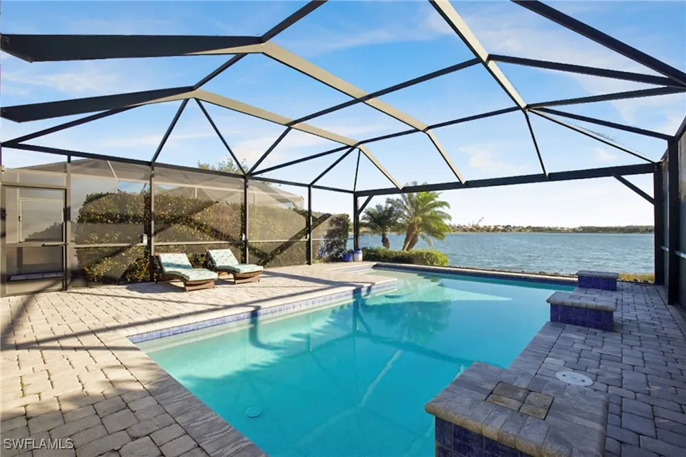 Live like you are on vacation every day in the resort-style community of Corkscrew Shores in Southwest Florida. Enjoy panoramic pool & water views overlooking the 240-acre sparkling Big Lake with sensational, unobstructed vistas. Indoor and outdoor living (1888 sq ft total) seamlessly blend as you step onto the covered patio, offering ample entertaining space within the screened lanai featuring a custom pool with cascading waterfalls. Easy living awaits in this 2–3 bedroom, two-bath home, sold fully FURNISHED and ready for you now. The open floor plan includes tall ceilings, white cabinetry, crown molding, tile flooring in the main gathering areas, and an attached garage. The gourmet kitchen offers an oversized island with seating, abundant cabinetry, and generous storage. The owner’s retreat showcases water views and a spa-like bath with dual sinks and a walk-in closet. No club fees or CDD tax. Not in a flood zone. Amenity island overlooking the 240-acre lake features a zero edge pool with fountains, spa, indoor/outdoor restaurant and bar, and firepits. Enjoy kayak and canoe launch, fishing pier, non-gas boating, 24-hour state of the art fitness center, movement studio, basketball, tennis, bocce, ping pong, and pickleball courts, playground, picnic area, and scenic nature trails. Conveniently close to FGCU, RSW Airport, Hertz Arena, open air shopping, and dining.