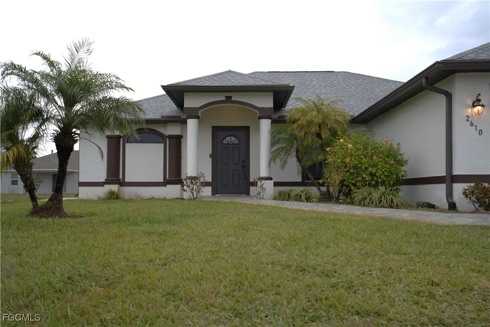 Welcome home to this beautifully maintained 4-bedroom, 2-bath gem with a 2-car garage and a bright, open layout—with NO HOA and NOT located in a flood zone! Enjoy tile flooring and crown molding throughout, cathedral ceilings in the living/dining area, and a stunning tray ceiling in the master suite accented with wood detailing. The master bathroom has been nicely upgraded, featuring a beautifully updated shower. The kitchen offers Corian countertops and wood cabinetry, while the bathrooms feature granite countertops. You’ll love the abundant storage, including generous wall-to-wall closet space in the bedrooms. Step out to the large screened lanai, perfect for relaxing or entertaining, and appreciate extras like the epoxy-coated garage floor, paver walkways/side area surrounding the home, and an IRRIGATION system to help keep the yard looking its best. Added peace of mind comes with IMPACT resistant windows and doors (insurance savings + peace of mind in Florida), a NEW ROOF (2024), and a newer A/C system (2023). All of this is situated on approximately 0.25 acres. Ideally located near Sunshine Blvd, Lee Blvd, and SR-82, with easy access to Southwest Florida International Airport (Fort Myers / RSW), plus shopping, dining, and everyday conveniences just minutes away. This property may qualify for multiple financing options, including Conventional, FHA, VA, USDA (if eligible), and Florida first-time buyer programs, including the Florida Hometown Heroes Program and other down payment assistance options. Buyers should verify eligibility with their lender.