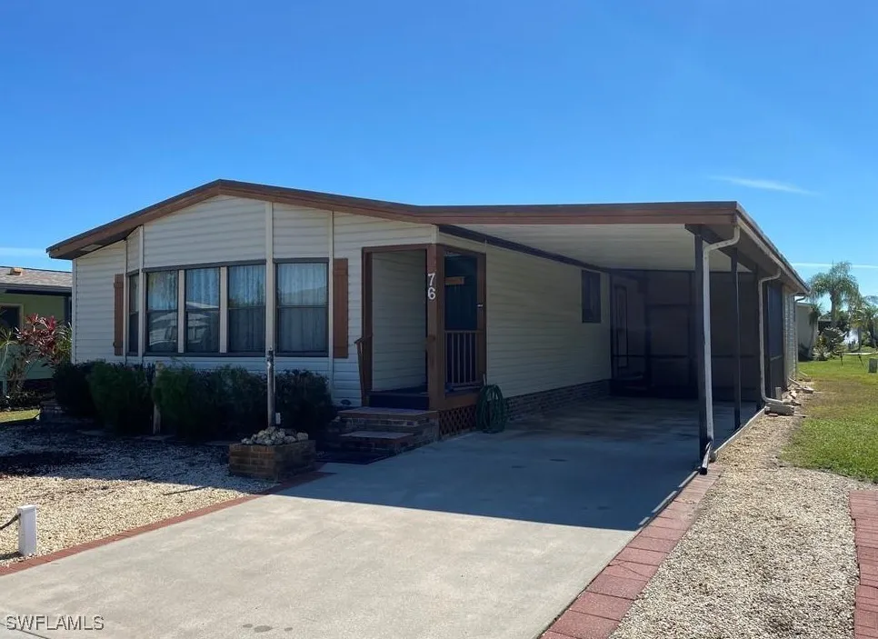 Welcome to 76 Atlantic Way, located in the highly desirable Windjammer Village 55+ community, a true hidden gem in the heart of Naples. This property is fee-simple ownership — you own the land (NOT a land lease), a significant advantage rarely found at this price point. Featuring 1,332 square feet, this 2-bedroom, 2-bathroom home with carport boasts a well-designed, open layout with generously sized rooms, ample closet space, and a fireplace—a rare and charming feature in this community. The bedroom configuration offers privacy, while the expansive living areas create the perfect setting for entertaining or relaxed everyday living. The interior is original and ready for updating, offering an excellent opportunity to customize and add value. Additional highlights include extra exterior storage, a screened side patio that meets the long drive way carpot, and a newer roof and siding (2017), providing peace of mind and reducing future capital expenses. The property is being sold AS-IS with right to inspect, making it ideal for cash buyers, seasonal residents, or investors seeking a well-located home with strong upside potential. Windjammer Village is a quiet, well-maintained 55+ community known for its low maintenance fees and inviting amenities, all while being centrally located near everything Naples has to offer. - Minutes to banks, shopping, dining, and everyday conveniences - Quick access to I-75 for easy travel north or south - Short drive to downtown Naples, beaches, and medical facilities - Peaceful neighborhood atmosphere with an active adult lifestyle This unbeatable central location allows residents to enjoy the best of Naples living without the premium price tag.
